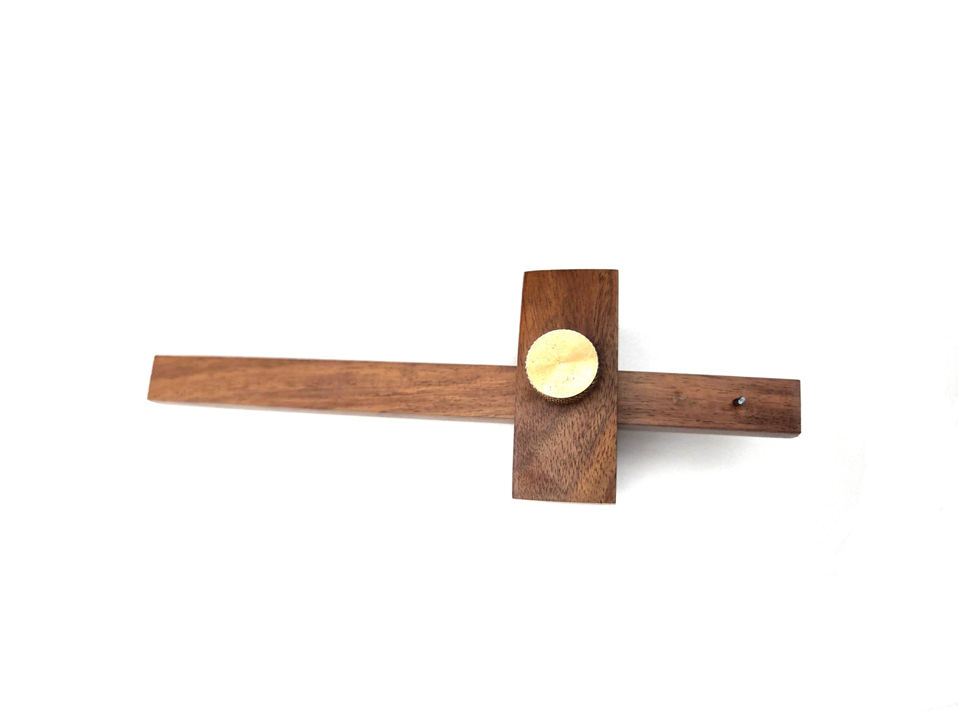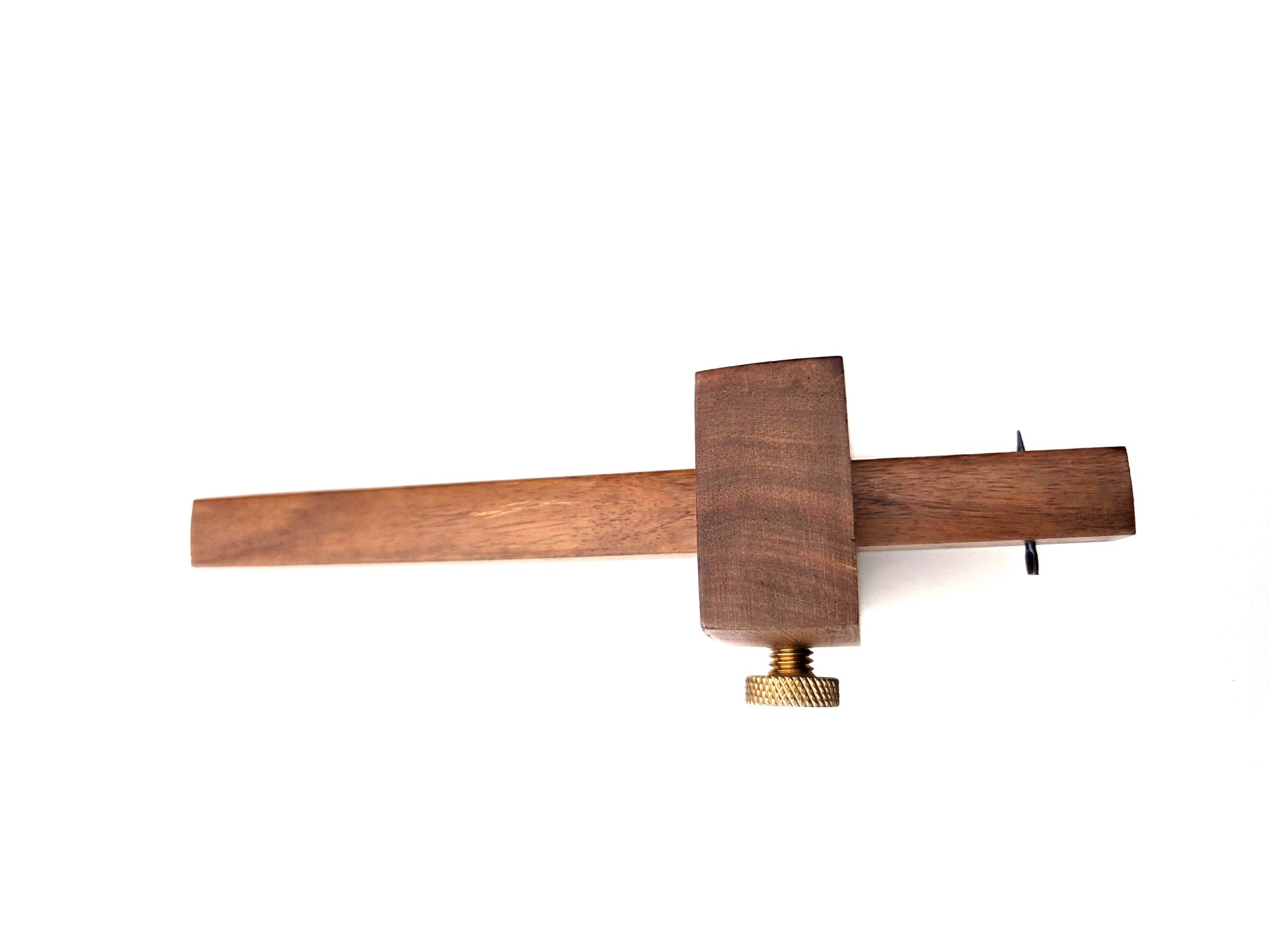 Een markeerhout zonder maatverdeling. Markeerhout voor het snijden van een lijn parallel van een rand. Deze markeerhout heeft een bereik van 150 of 225 mm. Deze markeerhout heeft een kraspen en leidt tot preciezere aftekening.