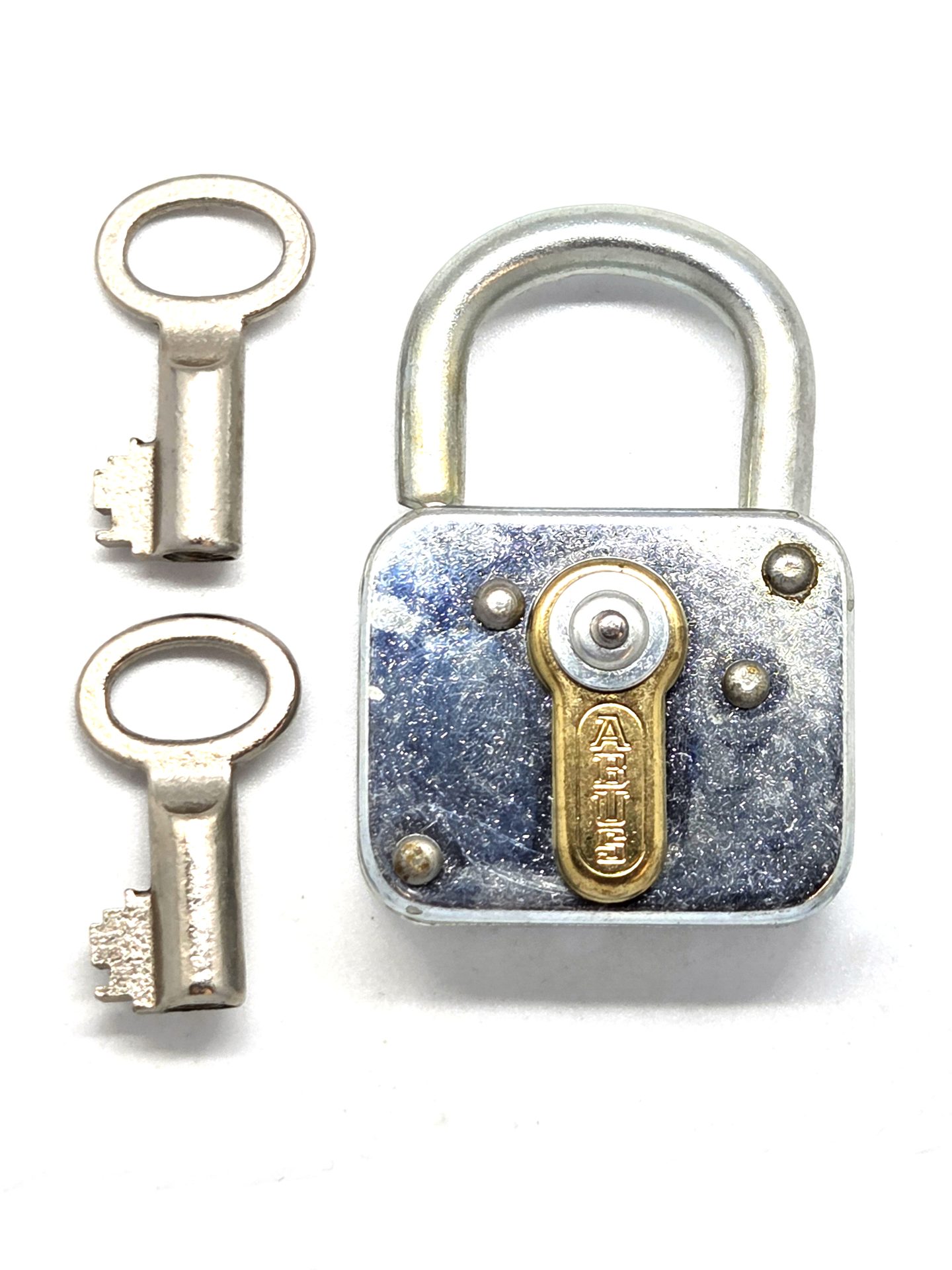 Hangsloten, een klein hangslot om kastje, kist of een doosje af te kunnen sluiten. Klassiek hangslot met een klavier sleutel. Kast = 50 mm. Het slotje wordt met 2 sleutels geleverd. Duitse vintage pendel hangslot.